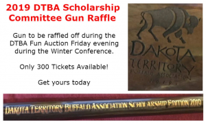 We are excited to announce that the DTBA is now offering a scholarship. We feel the future lies in our youth, and we’d like to help with continuing education. The scholarship will be open for applications Feb. 1-Apr.15. The application can be found on our website. We are not limiting applicants to any specific field, all majors welcome. We are, however, requiring that the applicant be affiliated with DTBA as either a member or having a member as their sponsor. We are having a raffle to help support this year and future years scholarship fund. The top prize is a Browning Lever Action 22-250 gun with DTBA Scholarship Edition engraved on the stock, second and third prizes are cash in the amount of $100 and $50. Winners will be drawn for at our winter conference. We are capping the amount sold at 300 tickets so get yours soon! Contact the DTBA at info@dakotabuffalo.com