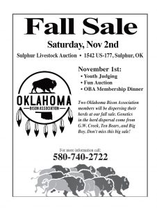 The Oklahoma Bison Association will hold it’s Fall bison auction on November 2, 2019 at Sulfur Livestock Sale in Sulphur, OK. Animals are to arrive on November 1st, which will also include a Bison Junior Judging competition and the OKBA banquet dinner. Contact Dr. Gerald Parsons at 580-759-3605 or 580-759-5209 for more information.