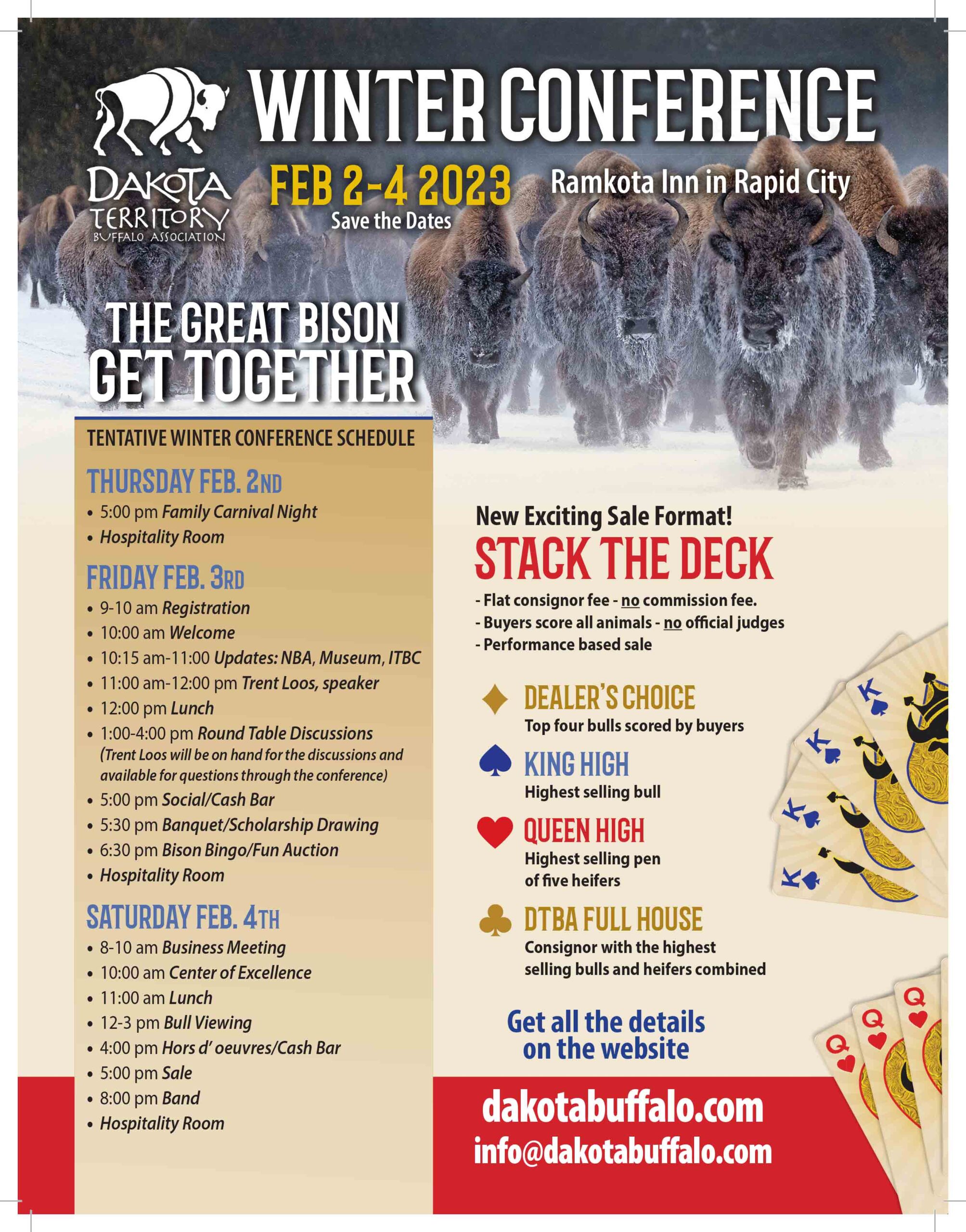 We are all excited for the Dakota Territory Buffalo Association’s 2023 Winter Conference, and the 1st annual Stack the Deck Show and Sale, February 2nd-4th at the Ramkota Inn in Rapid City, South Dakota. You spoke, we listened, and I think we have a great line-up of informative speakers, engaging discussion, and lot of fun for “The Great Bison Get Together.”