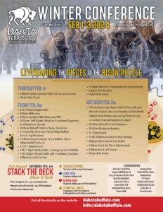 We are all excited for the Dakota Territory Buffalo Association’s 2024 Winter Conference, and the 2nd annual Stack the Deck Show and Sale, February 1st – 3rd at the Ramkota Inn in Rapid City, South Dakota. This year is going to be a lot of fun and we are all going to learn a lot with our theme, “Leveraging the Pieces of the Bison Puzzle.”