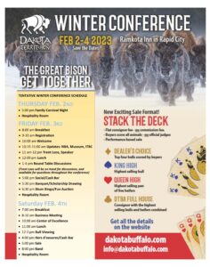 Read MoreWe are all excited for the Dakota Territory Buffalo Association’s 2023 Winter Conference, and the 1st annual Stack the Deck Show and Sale, February 2nd-4th at the Ramkota Inn in […]
